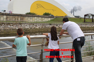 Cuando llegamos aparcamos en el Centro Niemeyer. Este es un centro cultural, que fue diseñado por un arquitecto brasileño, al que se debe su nombre. El centro es una mezcla entre arquitectura y escultura, y esta formado por el auditorio, una plaza grandisima, una torre-mirador y una cúpula.
